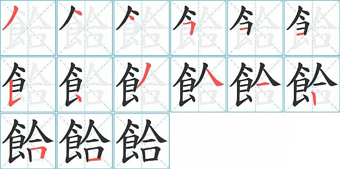 餄的笔顺是撇、点、点、横折、横、横、竖提、点、撇、捺、横、竖、横折、横。
