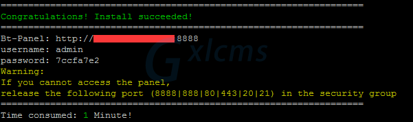 安装完成后,会提示安装成功的提示,面板地址,面板账号还有密码,(如图):
