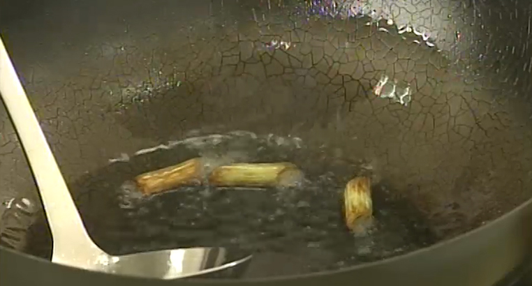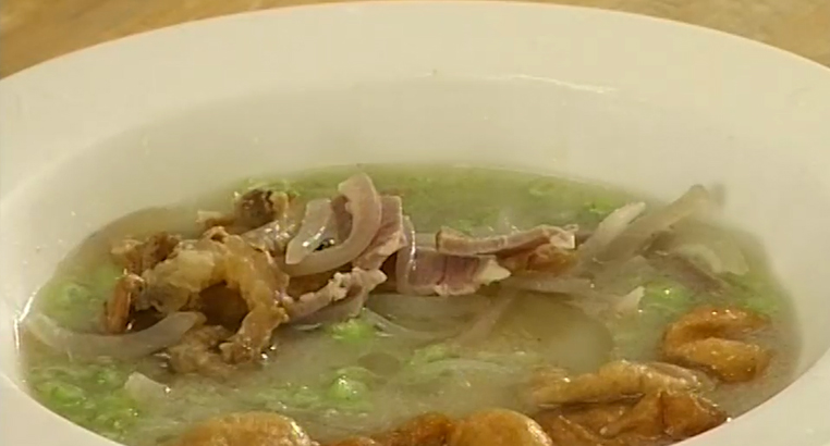 1.锅中倒入适量油,凉油下锅把葱段炸出香味来,颜色为金黄色。要小火炸,火大葱段会糊锅,味道就不好了。葱油炸好后倒入准备好的碗中备用。锅中在放少量的油,虾仁下锅炒香,小火放入适量的清水,把猪肉皮、火腿倒入锅中煮,开锅后捞出备用。把米粉先泡发,然后放入锅中煮。